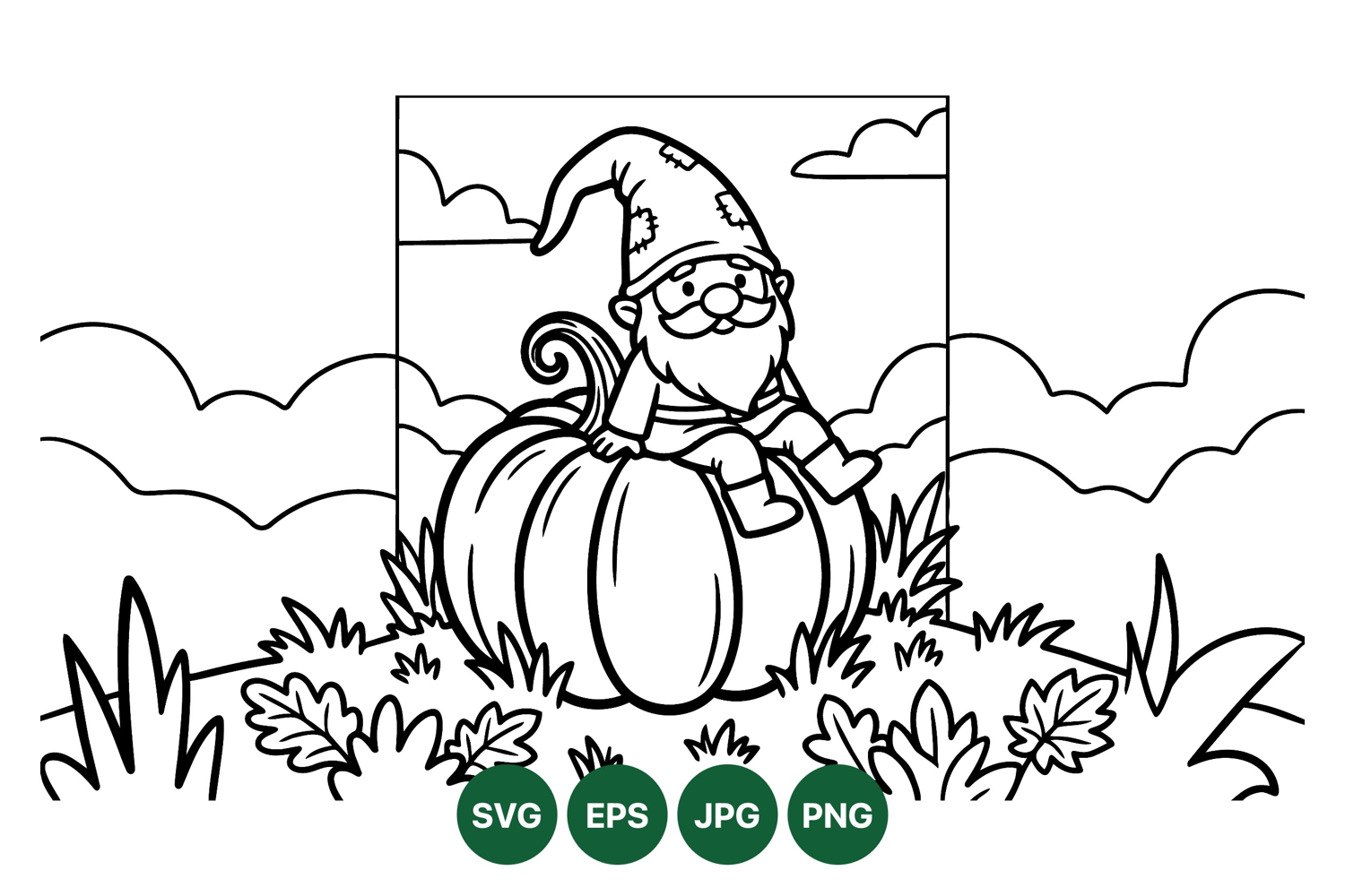 Black and white vector line art shows a joyful gnome perched on a large pumpkin with surrounding grass and leaves under a cloudy sky perfect for coloring or seasonal designs.