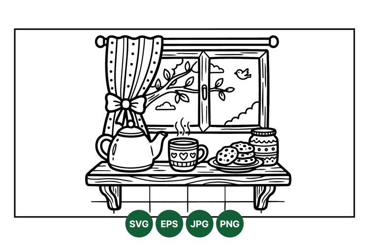 A cozy kitchen scene displays a steaming cup of tea beside a teapot with a tied curtain framing a window showing clouds birds and tree branches in peaceful line art style