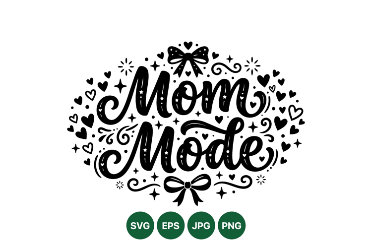 Elegant hand lettered mom mode phrase surrounded by hearts stars and decorative bows in black and white vector style perfect for mothers day gifts and cards loving
