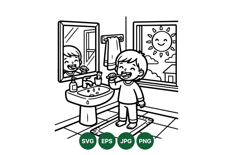 Line art of a happy boy brushing his teeth in a bathroom setting with a sink mirror towel and a sunny day visible through the window creating a peaceful morning mood