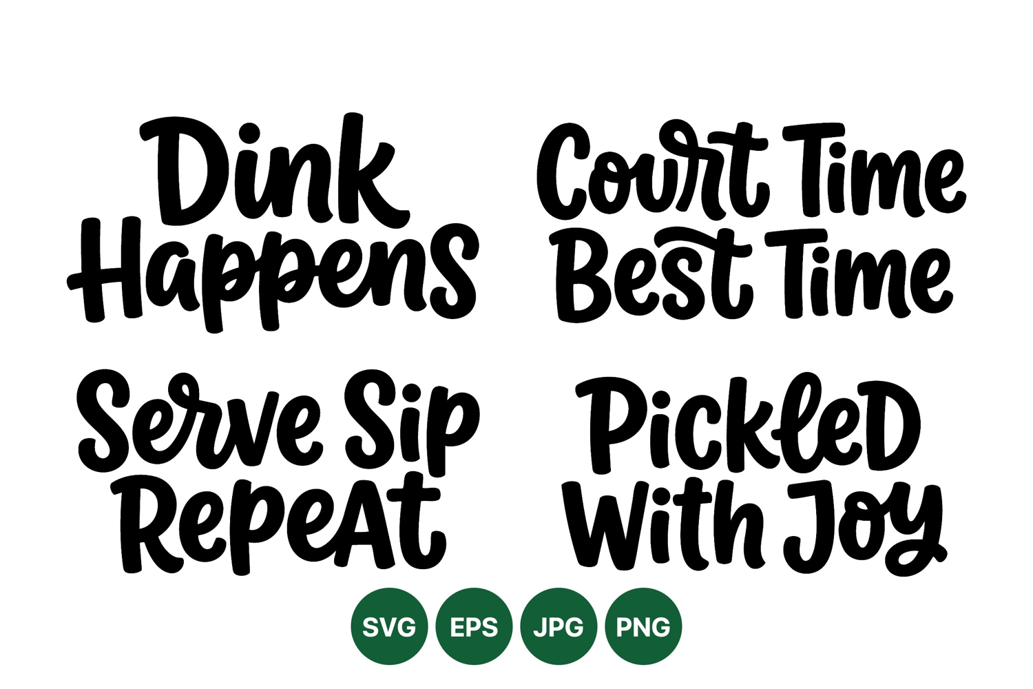 of hand drawn typography phrases including dink happens serve sip repeat court time best time and pickled with joy in bold black lettering vector style with playful mood