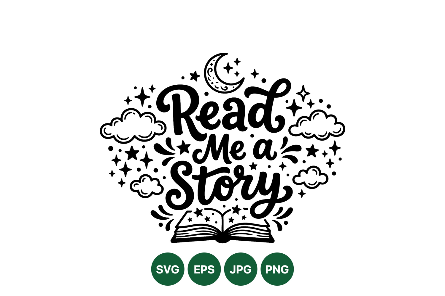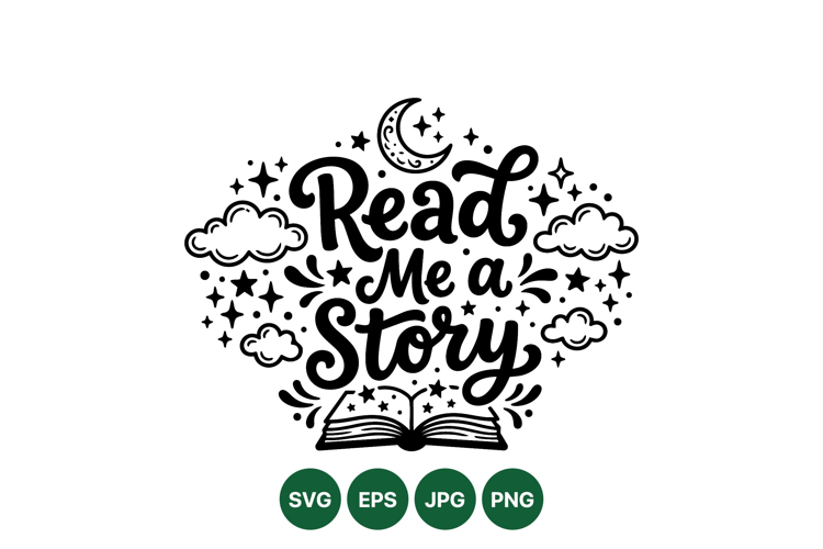 Decorative hand lettering saying read me a story surrounded by clouds stars moon and an open book in black and white vector style with whimsical charming mood