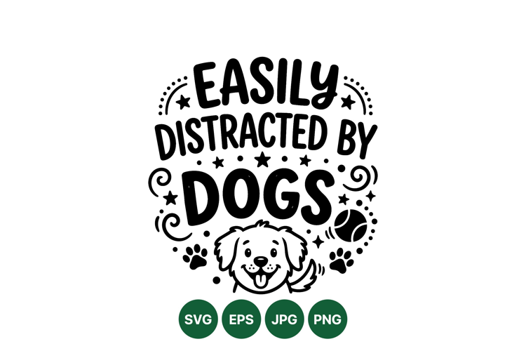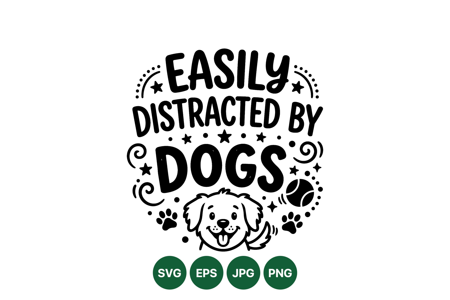 Black and white vector art shows a happy cartoon dog wagging its tail under playful text easily distracted by dogs with stars paw prints and a ball for a fun look