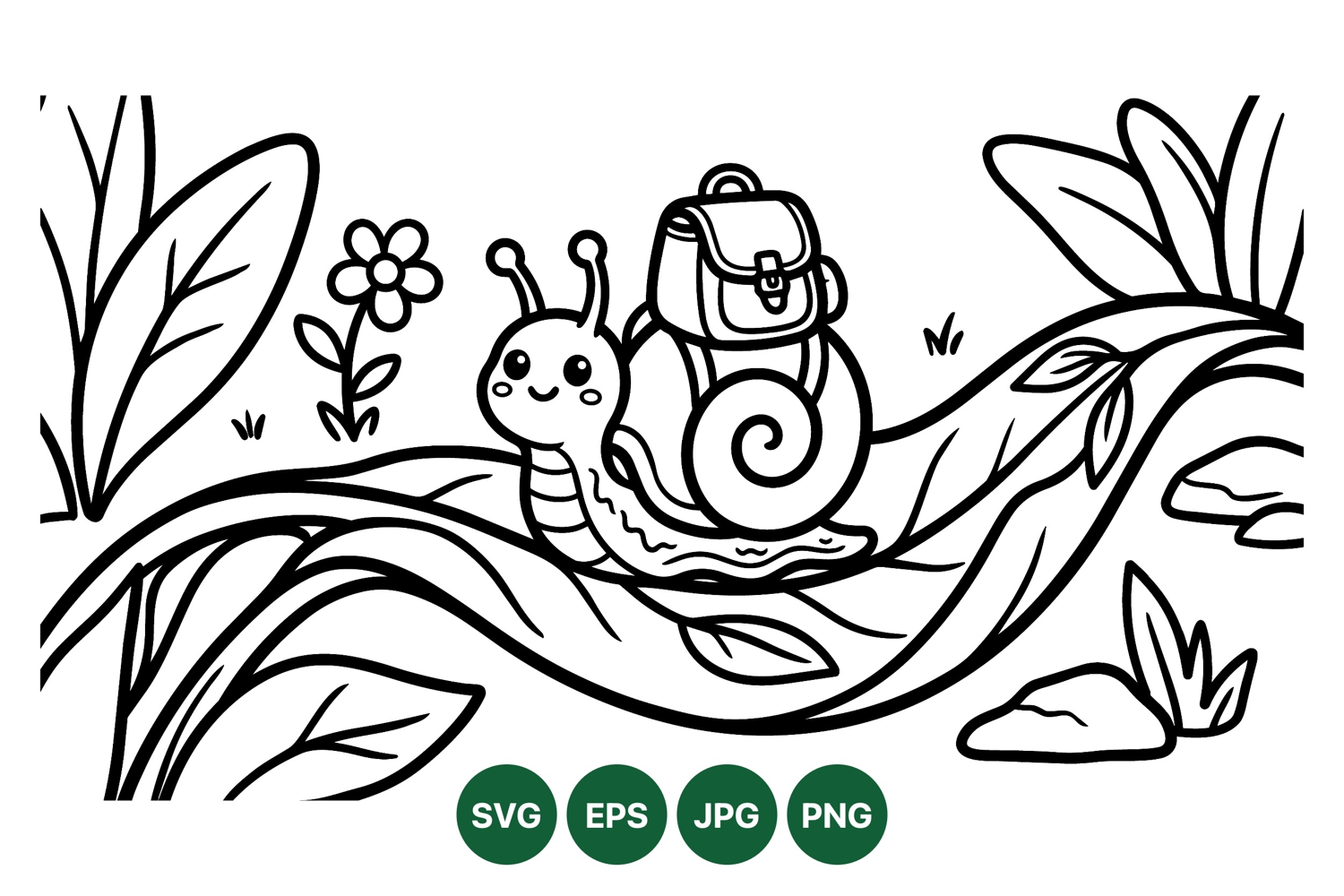 A cheerful snail with a backpack crawls along a curved branch surrounded by large leaves and small flowers in a playful black and white cartoon line art style