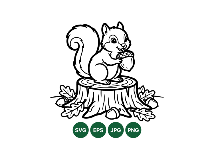 A cheerful cartoon squirrel grasps a large acorn while perched on a tree stump surrounded by oak leaves and acorns in crisp black and white line art style for childrens books or educational content playful