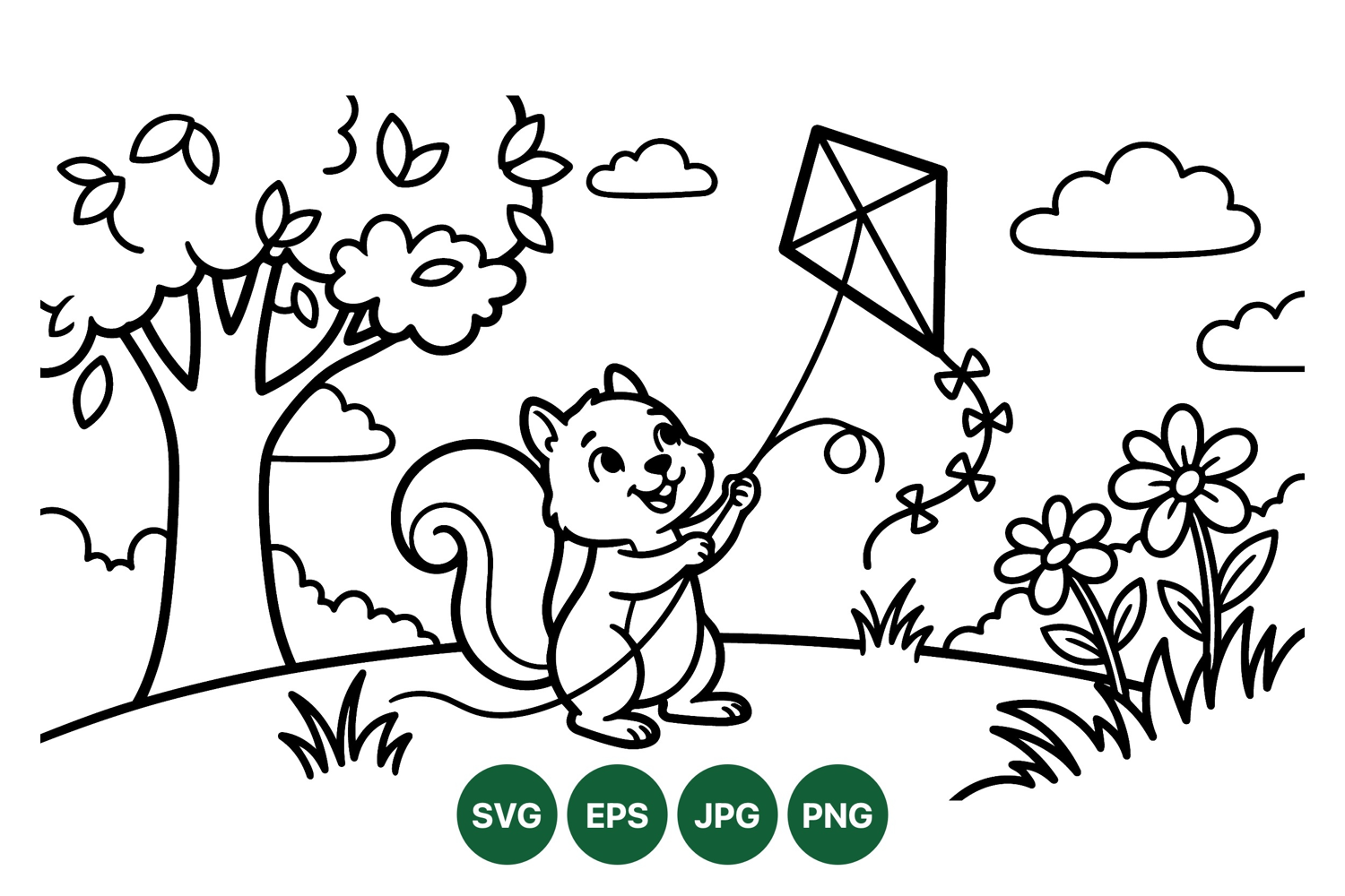 Line Art Illustration Cute Cartoon Drawing Spring Garden Graphic Black White Vector Outdoor Nature Scene Childrens Coloring Art Squirrel Animal Graphic Flying Kite Design Playful Wildlife Clipart Whimsical Forest Image