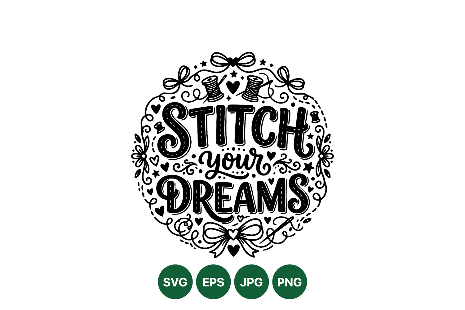 Intricate hand drawn black and white inspirational phrase stitch your dreams surrounded by needles thread bows hearts and floral doodles in decorative vector style ideal for crafting projects and prints