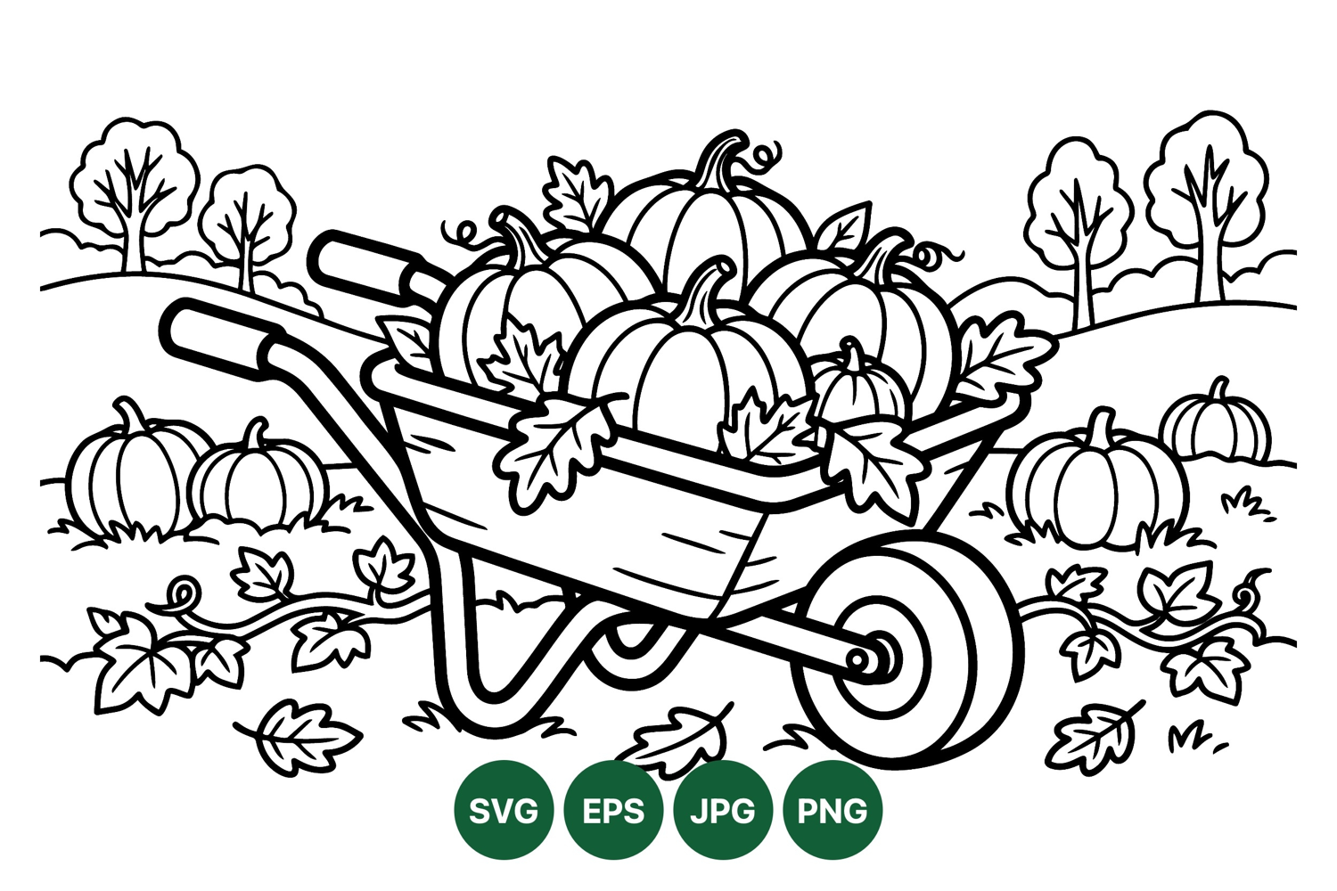 Fall Leaves Clipart Hand Drawn Pumpkin Autumn Harvest Clipart Thanksgiving Decoration Design Pumpkin Patch Graphics Rustic Harvest Illustration Black White Outline Wheelbarrow Garden Art Fall Season Vector Seasonal Farm Design