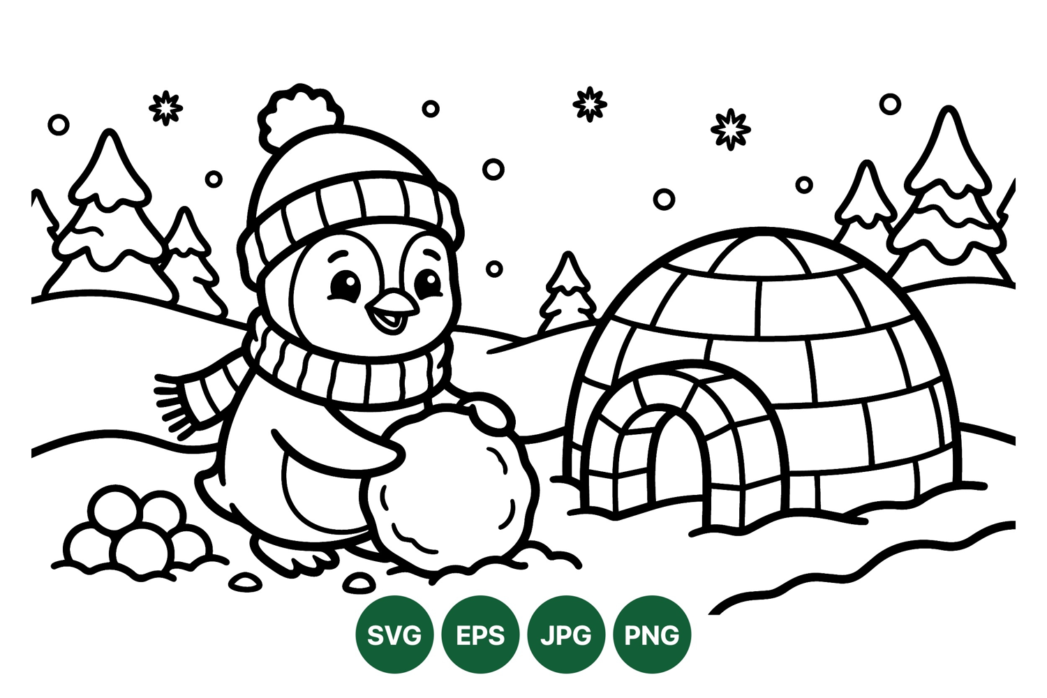 A playful penguin dressed in winter hat and scarf rolls a large snowball near a classic igloo surrounded by snow covered hills and pine trees under falling snowflakes in black and white line art style