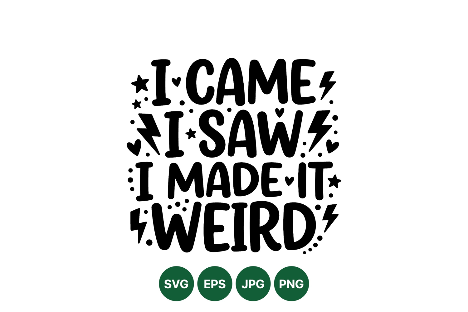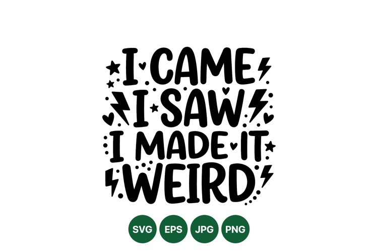 Bold black hand drawn lettering spells out the phrase i came i saw i made it weird accented with playful hearts stars and lightning bolts in whimsical style