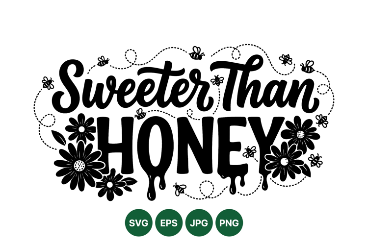Hand drawn style black and white typography spells sweeter than honey with dripping letter effect bees flying and floral elements surrounding the text in playful composition
