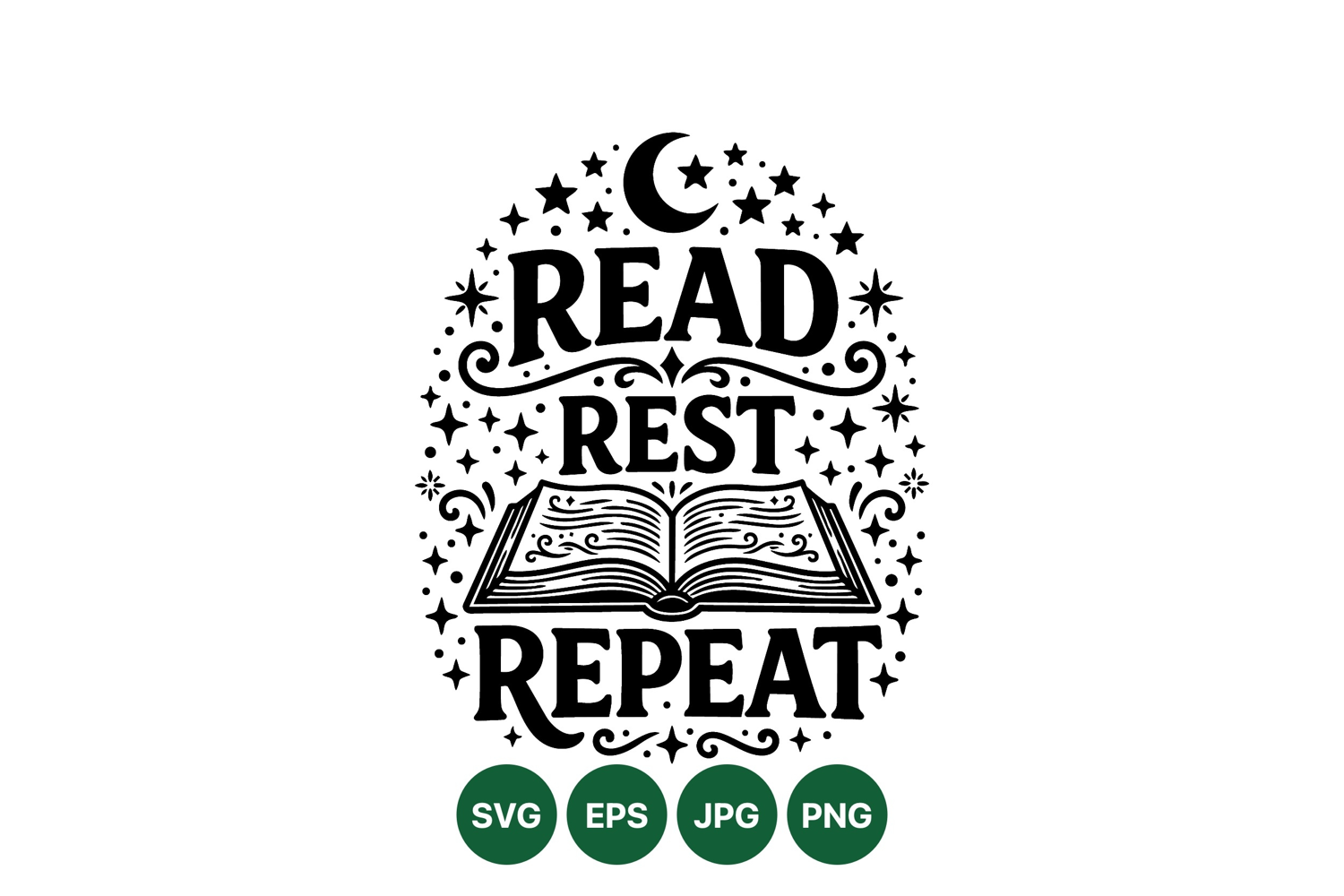 Vintage style black and white design featuring an open book with swirling lines surrounded by stars and a crescent moon with motivational text read rest repeat evokes calm and inspiration.