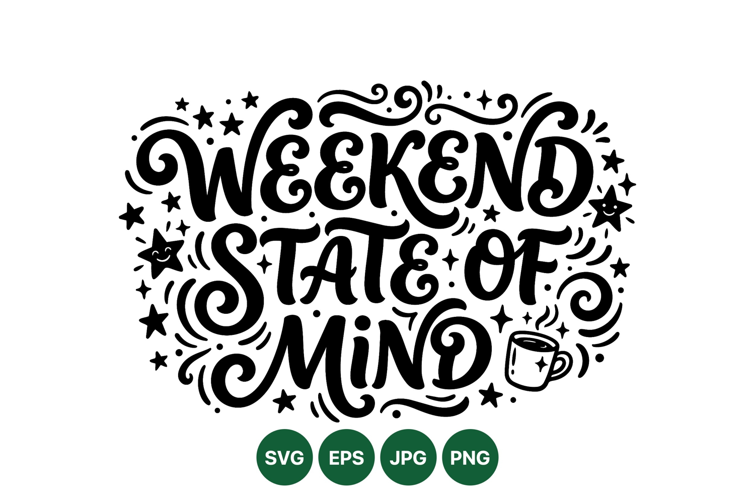 Whimsical hand lettering spells weekend state of mind surrounded by smiling stars and coffee cup icons in a playful black and white vector style suitable for posters or social media designs