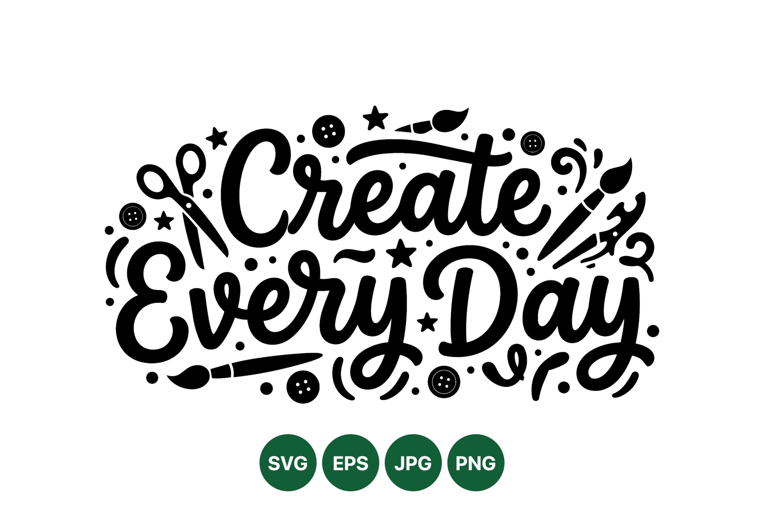 Stylish black hand lettering saying create every day surrounded by paintbrushes scissors buttons and decorative swirls emphasizes creativity and daily crafting in a vector style.