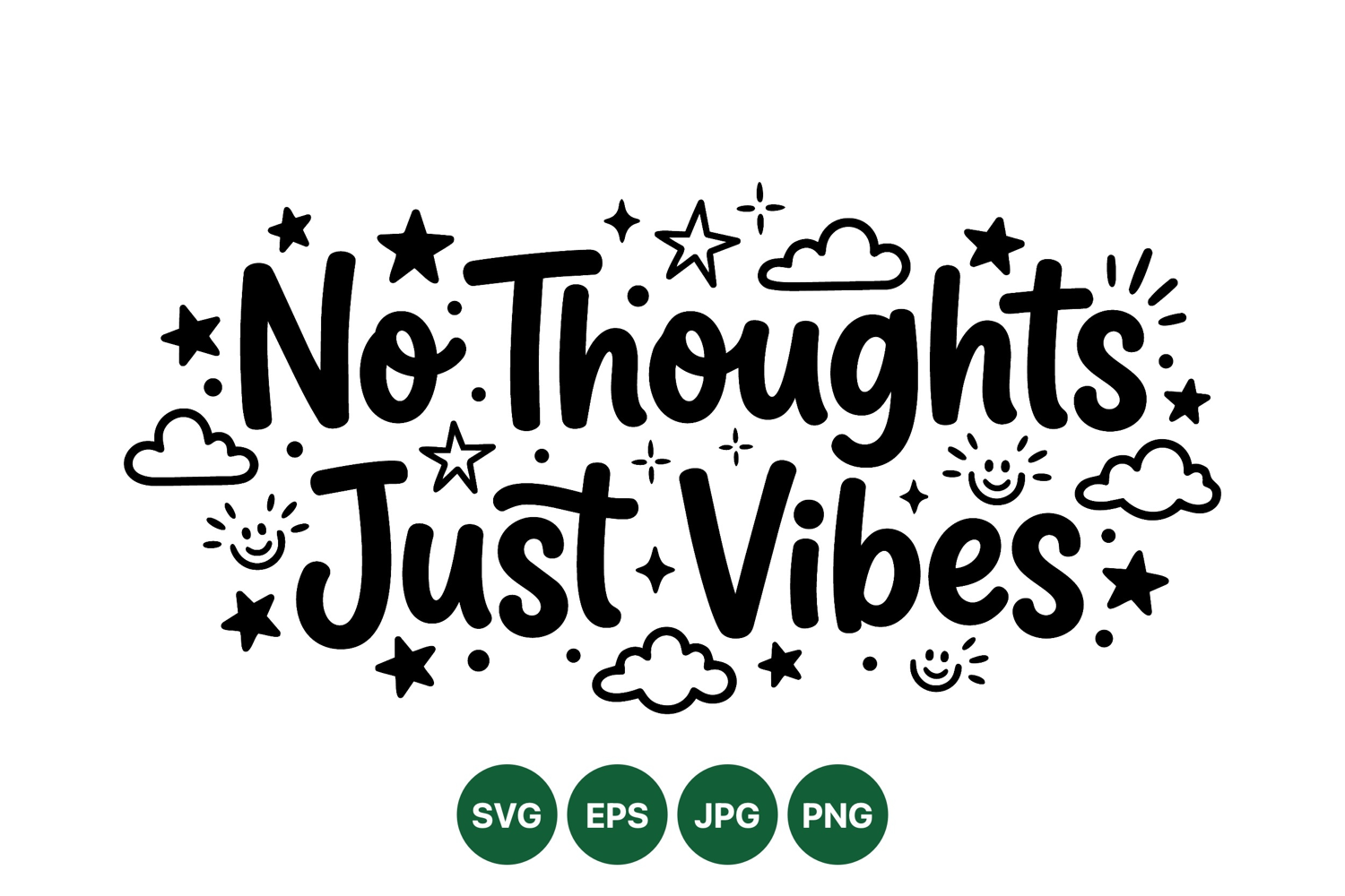 Hand lettered typography design spelling no thoughts just vibes with surrounding stars clouds and smiling faces in black and white vector art style ideal for posters and social media