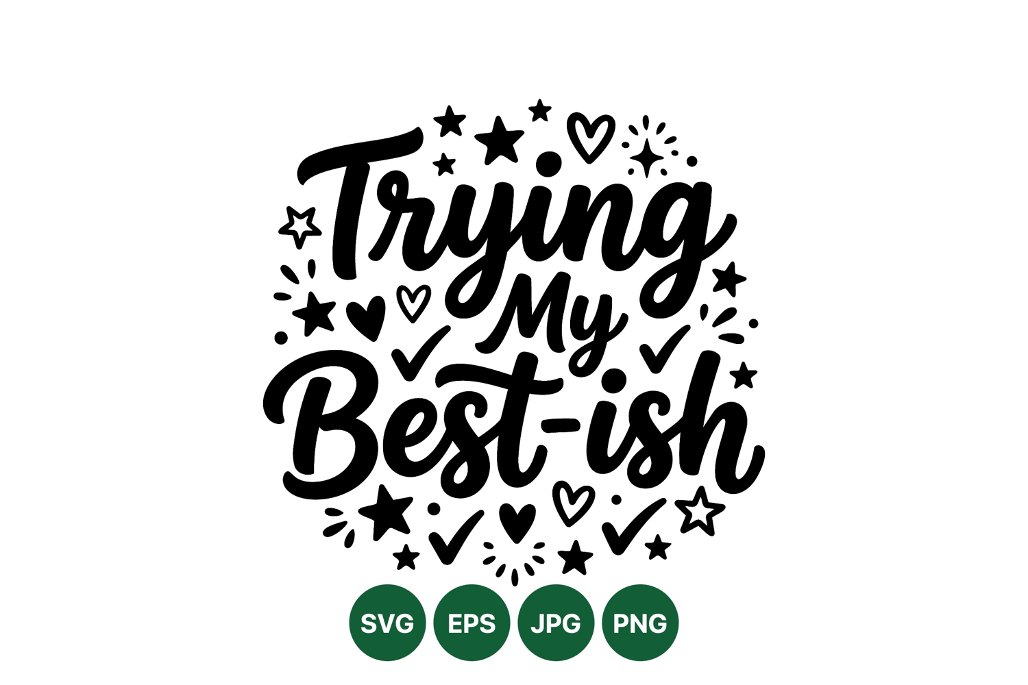 Hand drawn lettering with phrase trying my best ish surrounded by decorative stars hearts and check marks in black and white style, conveying encouragement and positivity mood.