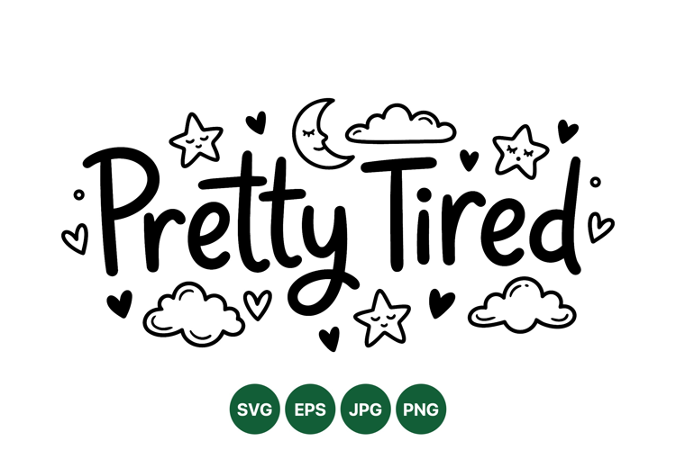 A hand drawn lettering phrase pretty tired surrounded by sleepy stars moon clouds and hearts in simple black line art style for prints and social media art creative and calm