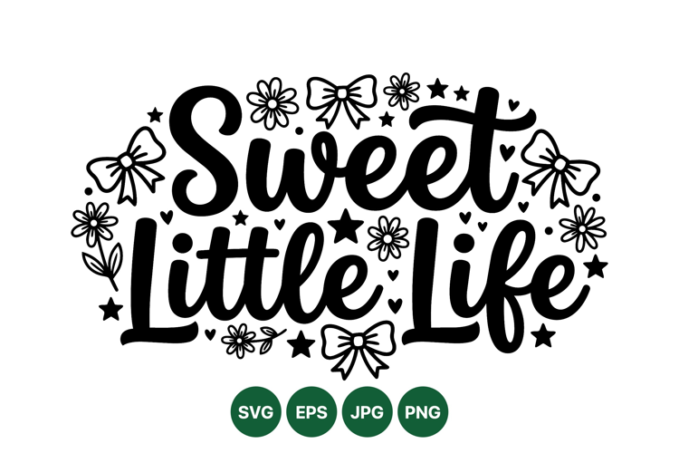 Hand lettered phrase sweet little life surrounded by stars bows and flowers with a charming decorative style suitable for greeting cards posters and social media posts