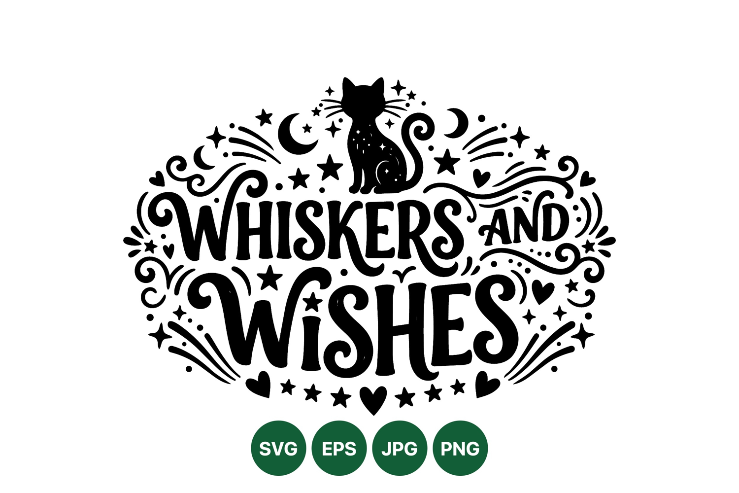 A whimsical black cat silhouette surrounded by stars moons hearts and swirling decorative elements framing the whimsical lettering whiskers and wishes in vintage style peaceful elegant design