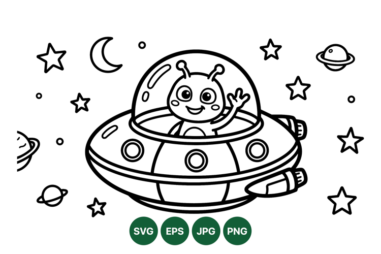 A cheerful alien waves from a detailed flying saucer surrounded by stars planets and moon in a cartoon style line art suitable for children books or coloring pages playful fun design