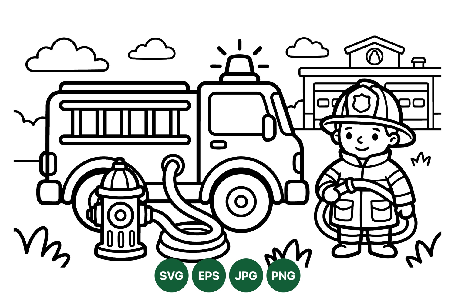 A friendly young firefighter character holds a fire hose beside a fire hydrant and fire truck outside the fire station in a simple black and white line drawing style perfect for coloring books or educational materials.