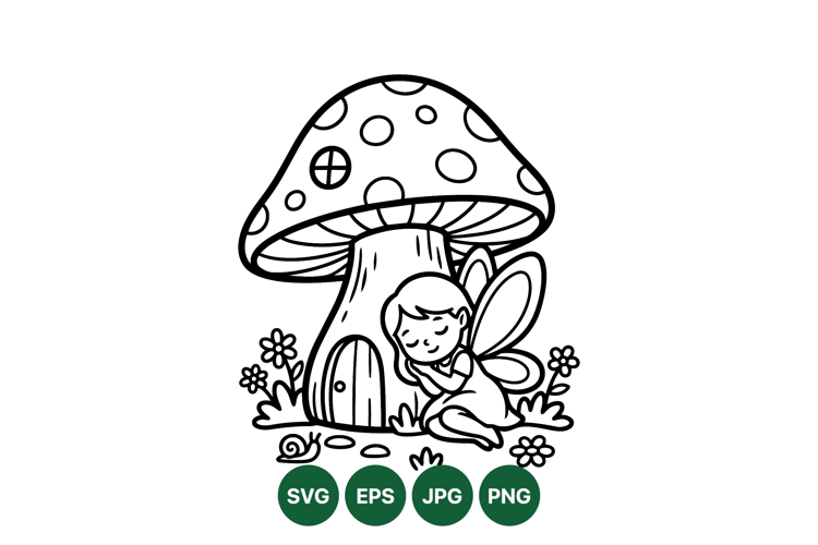 A peaceful sleeping fairy girl with delicate wings rests beside a large spotted mushroom house surrounded by small flowers and a snail in charming line art style