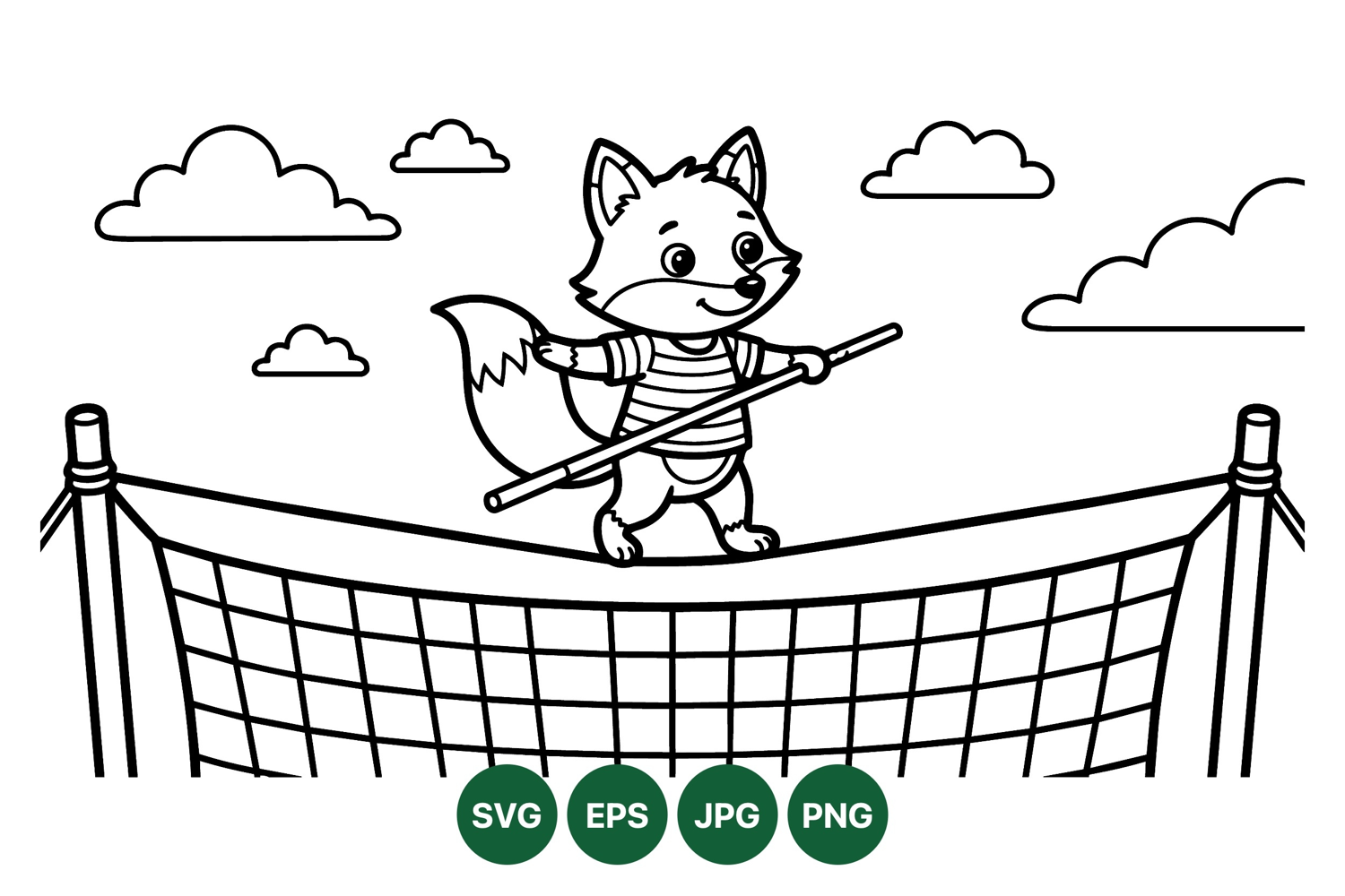 A playful cartoon fox balances carefully on a tightrope holding a balancing pole with a smile under a cloudy sky in a black and white outline style vector illustration.