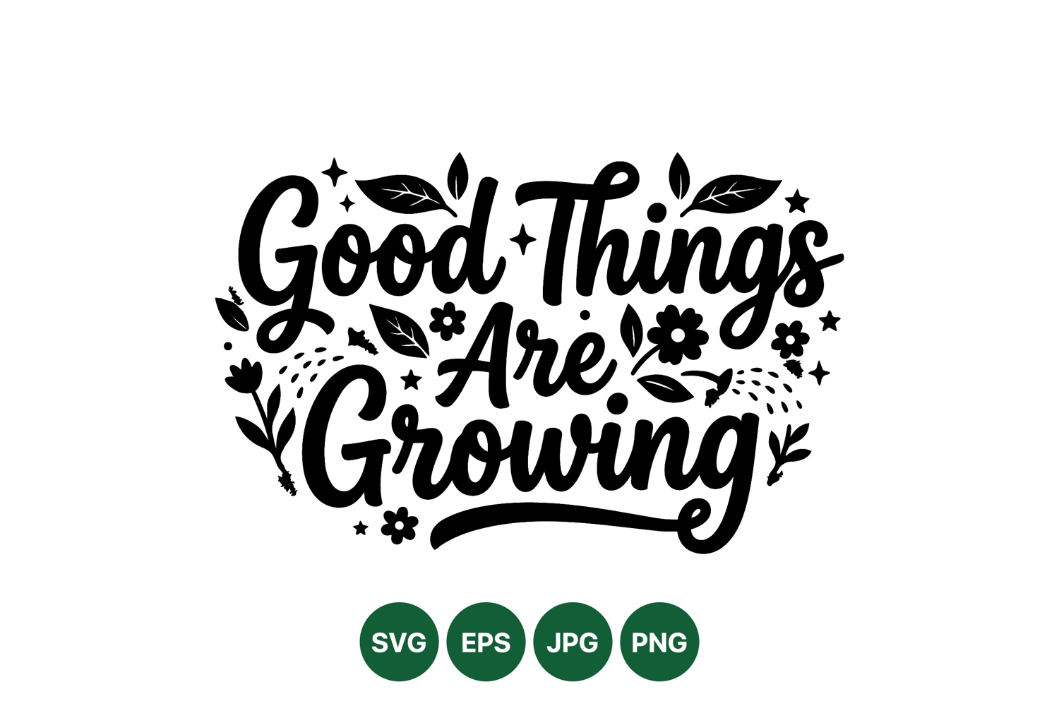 Black and white lettering design reads good things are growing surrounded by floral leaves flowers and sparkles in artistic botanical style with positive uplifting mood