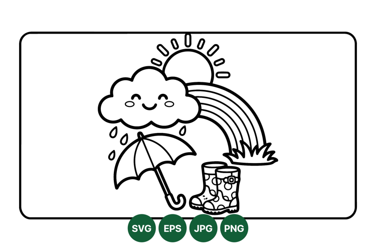 Cute Weather Clipart Line Art Drawing Sun And Rainbow Rainy Day Illustration Rain Boots Graphic Hand Drawn Rain Smiling Cloud Drawing Umbrella Vector Design Kids Weather Art Playful Rainy Icon