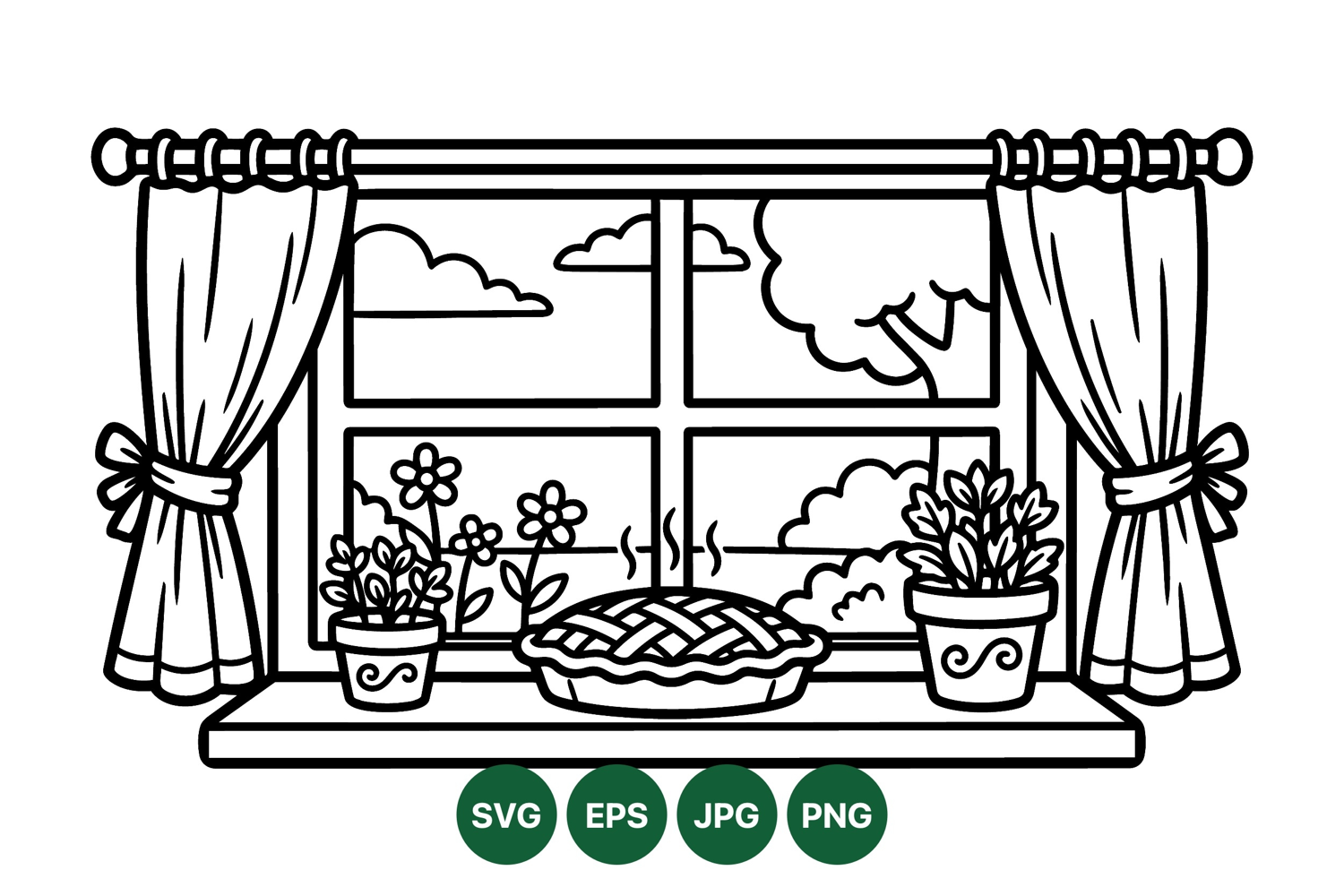 A black and white vector illustration depicts a cozy window sill with a steaming pie, two potted plants, tied curtains, and a view of trees and clouds outside rendered in line art style.