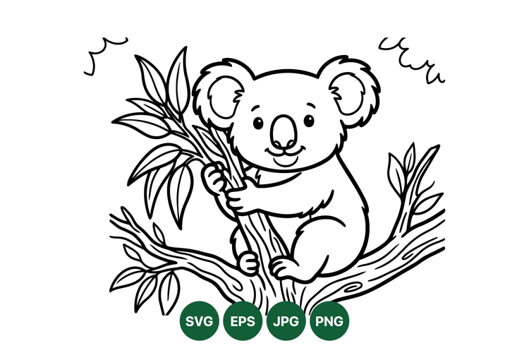Playful black and white line drawing of a happy koala clutching a eucalyptus branch while perched on a tree limb in a simple cartoon style peaceful and charming