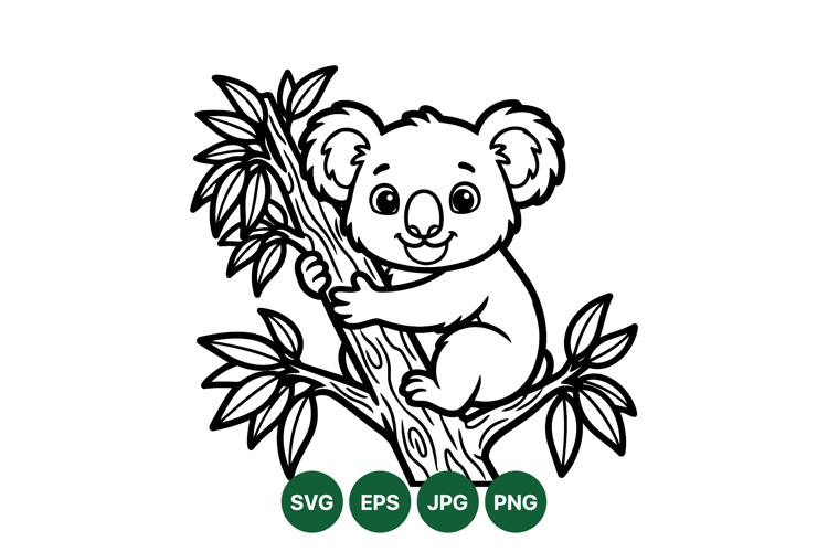 A black and white line art vector showing a cute cartoon koala climbing a tree branch with leaves smiling happily in a simple playful style suitable for kids content.