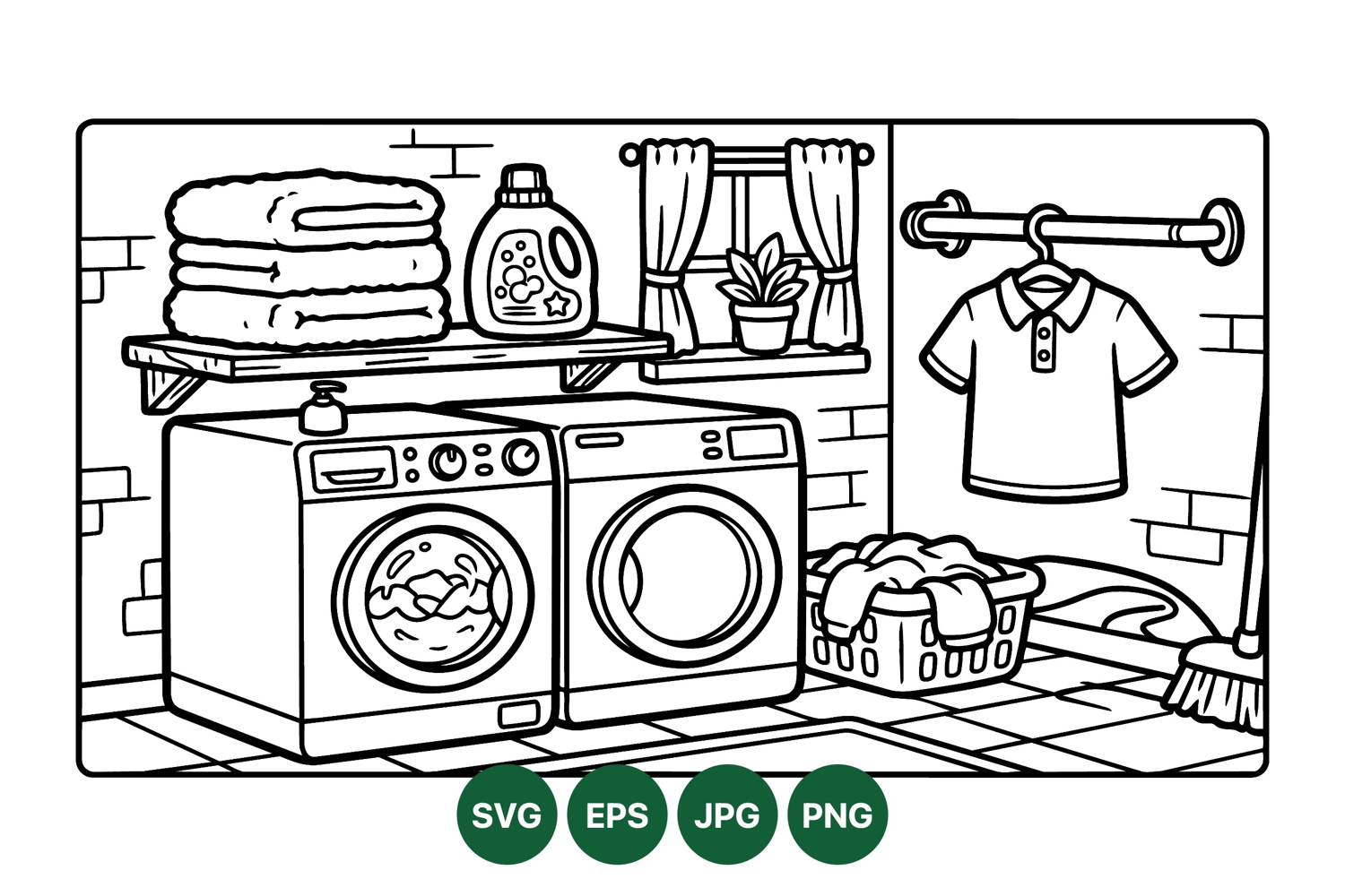 A detailed monochrome line art illustration of a laundry room showing a washing machine and dryer side by side with folded towels on a shelf and a shirt hanging nearby peaceful and clean