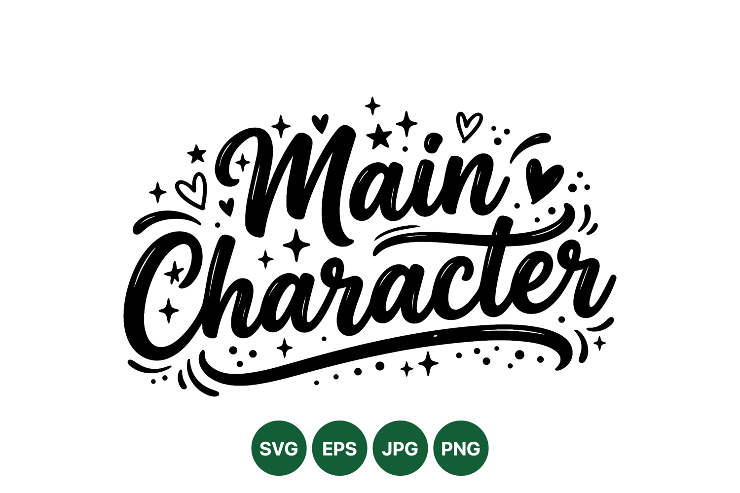 Elegant hand lettering calligraphy design spelling main character surrounded by decorative stars hearts and dots in black on white background for creative projects