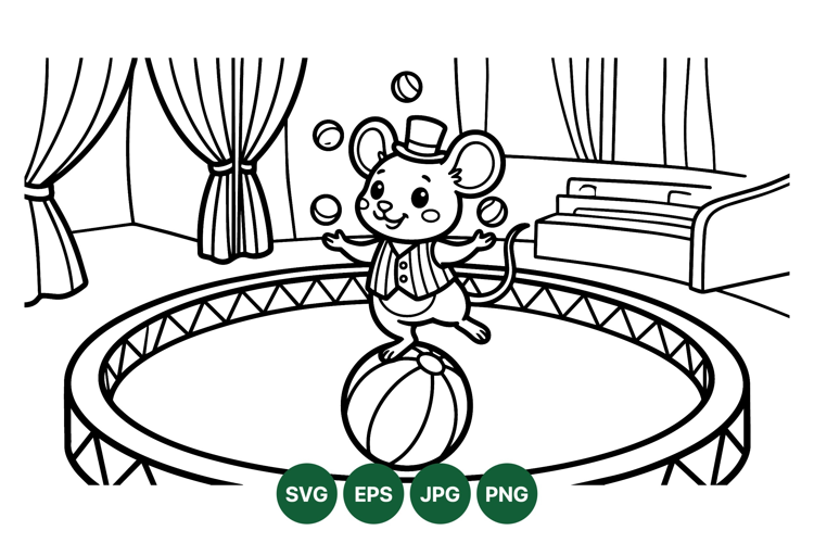 Adorable mouse character in top hat and vest balances on a striped ball while juggling multiple balls inside a circus ring with curtains and stage props in line art style playful charming