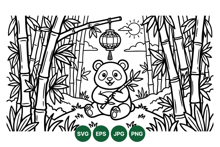 A panda sits holding a bamboo stick amidst a dense bamboo forest with a hanging lantern above and sun shining through clouds in a simple black and white line art style peaceful and charming