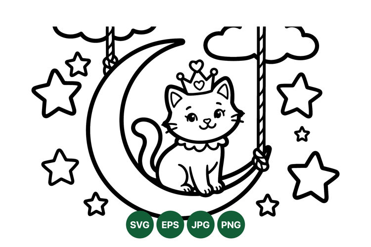 Playful cartoon style line art shows a cute cat with a crown sitting on a crescent moon swing surrounded by stars and clouds for whimsical children designs.