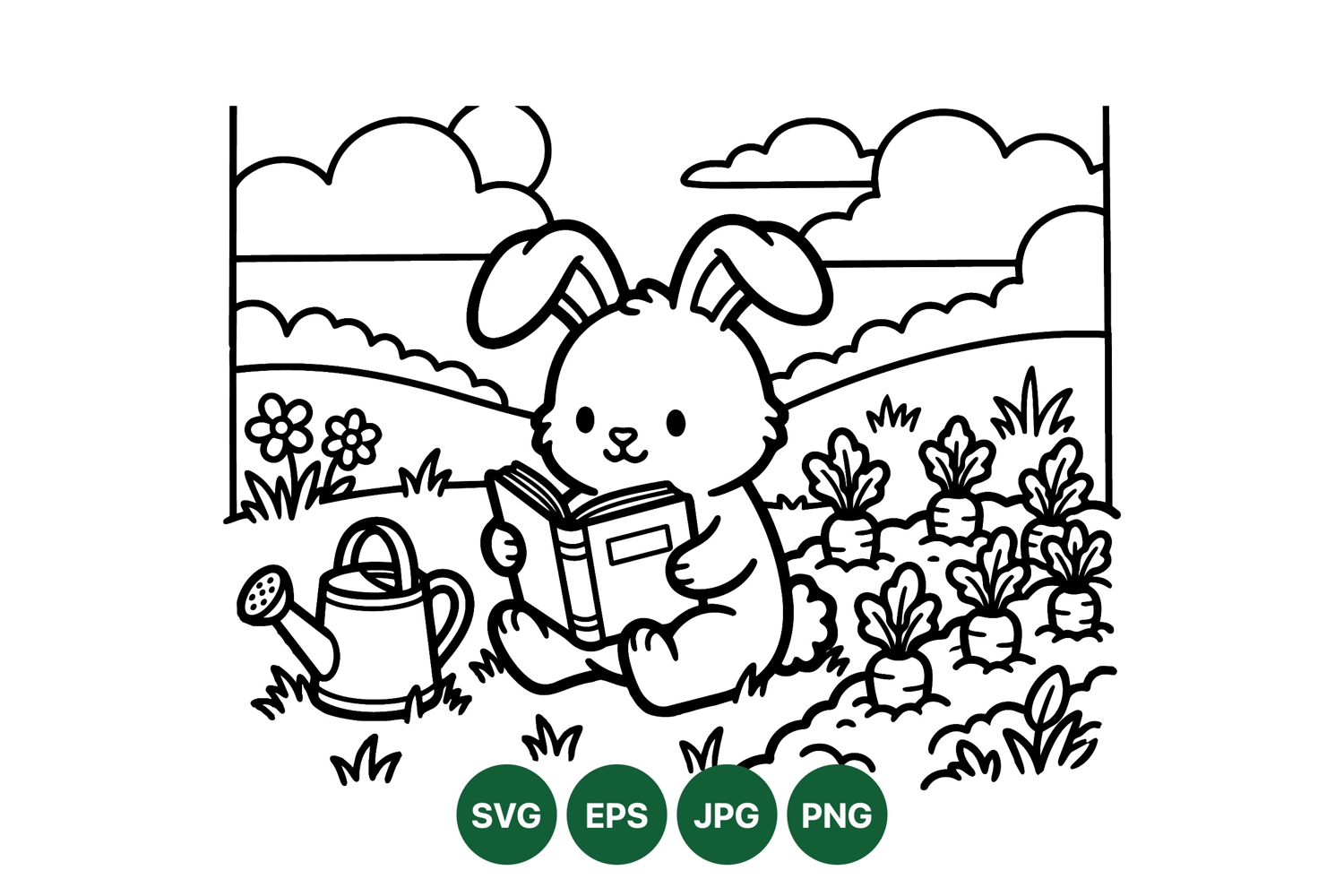 A charming black and white vector outlines a bunny sitting in a garden reading a book surrounded by carrots flowers and a watering can in a peaceful outdoor scene.