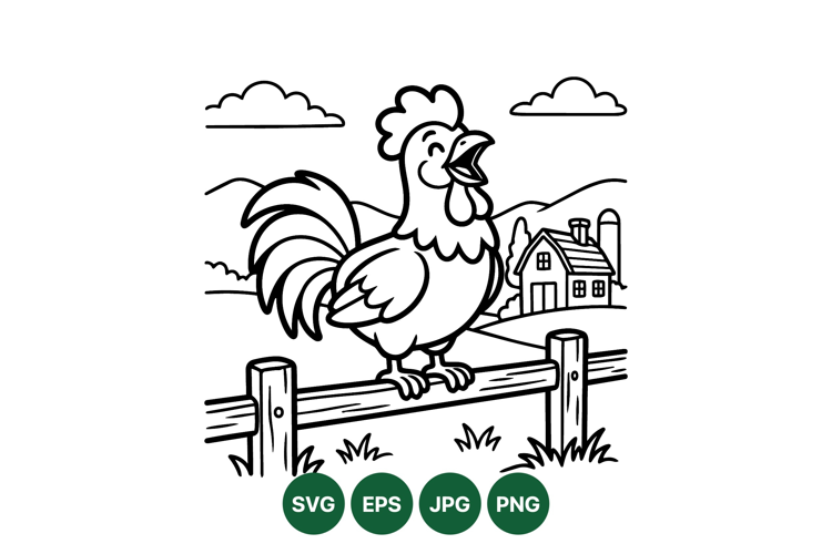 A detailed black and white vector illustration depicts a rooster crowing joyfully on a wooden fence in a serene rural farm setting with house hills and clouds peaceful scene