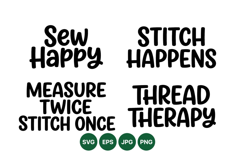 Playful hand drawn black lettering features four sewing themed quotes in a casual style, perfect for crafts, apparel prints, or hobby related designs with a cheerful mood.