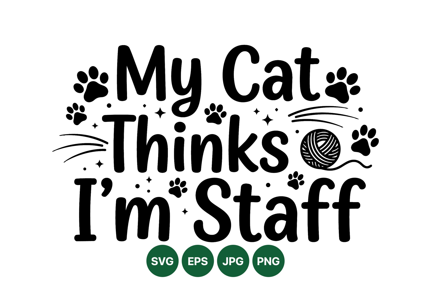 Humorous black and white flat design text reads my cat thinks im staff surrounded by paw prints and a yarn ball with playful decorative elements in minimalist style.