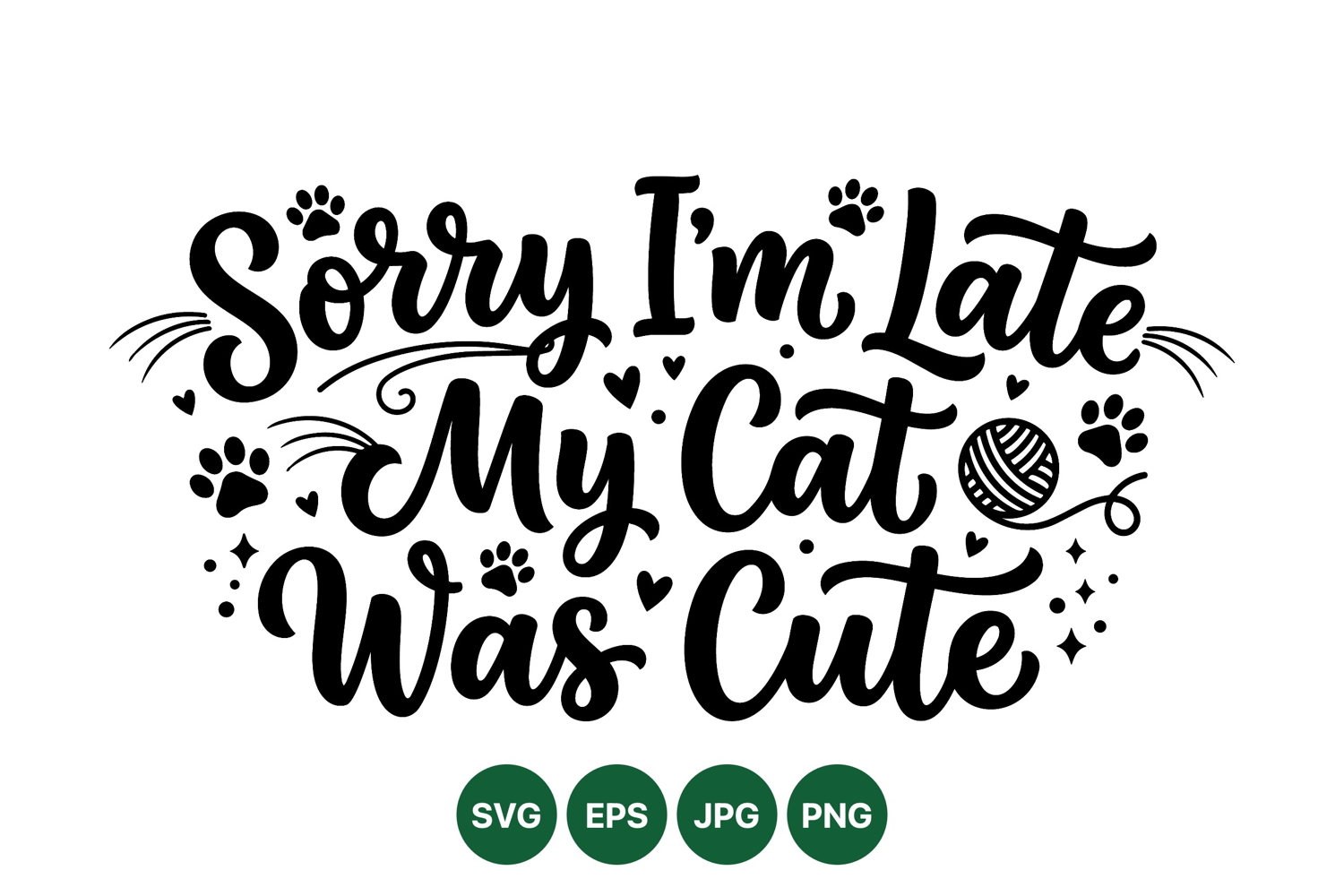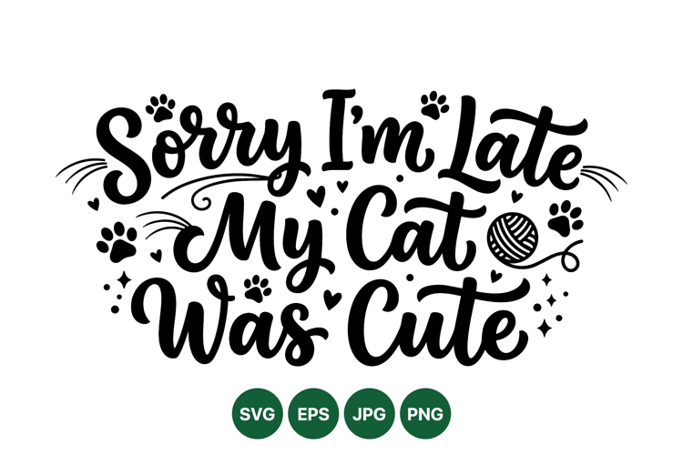 A playful hand lettering design featuring the phrase sorry im late my cat was cute with decorative paw prints and yarn ball in black and white vector style.