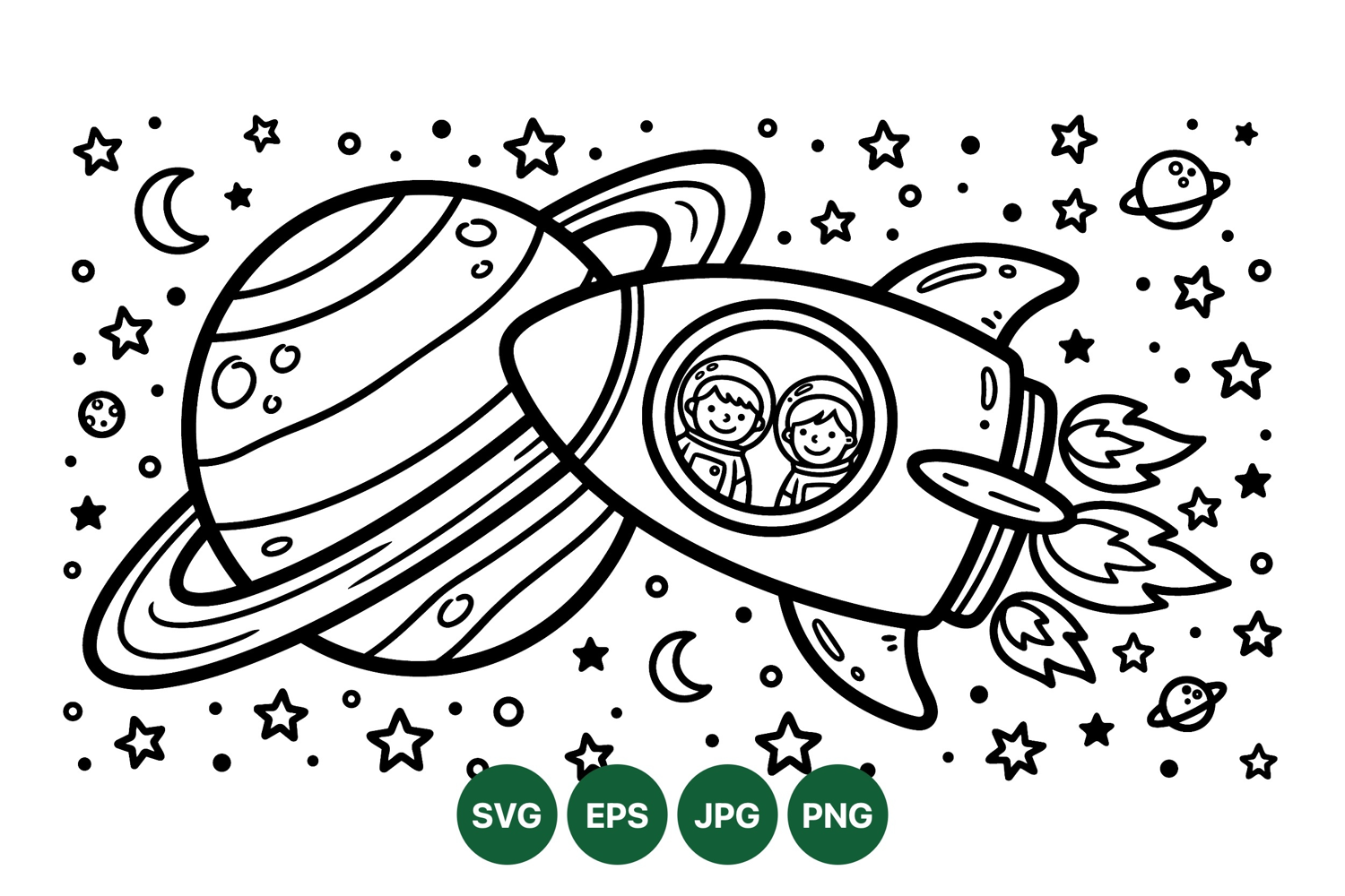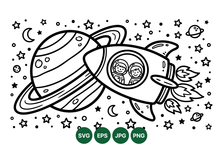A playful black and white line drawing displays a rocket ship flying close to a large ringed planet with two happy astronauts visible inside the porthole window among stars moons and planets in space whimsical style