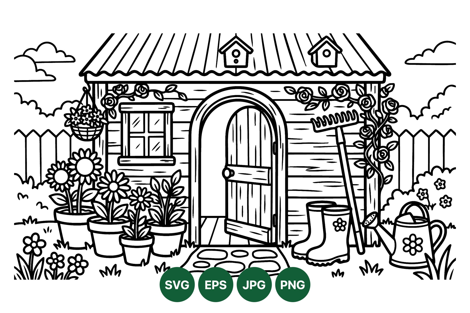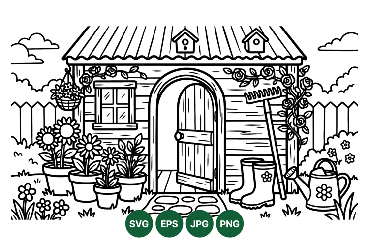 A charming garden shed features an open door with wooden framing surrounded by potted flowers rake watering can and rubber boots in an outdoor yard scene with fence and clouds simple black line art style peaceful