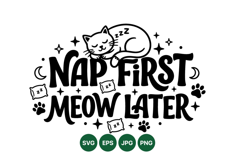 A flat design vector shows a sleeping cat curled above nap first meow later text decorated with pillows stars paws and crescent moons creating a playful calm mood