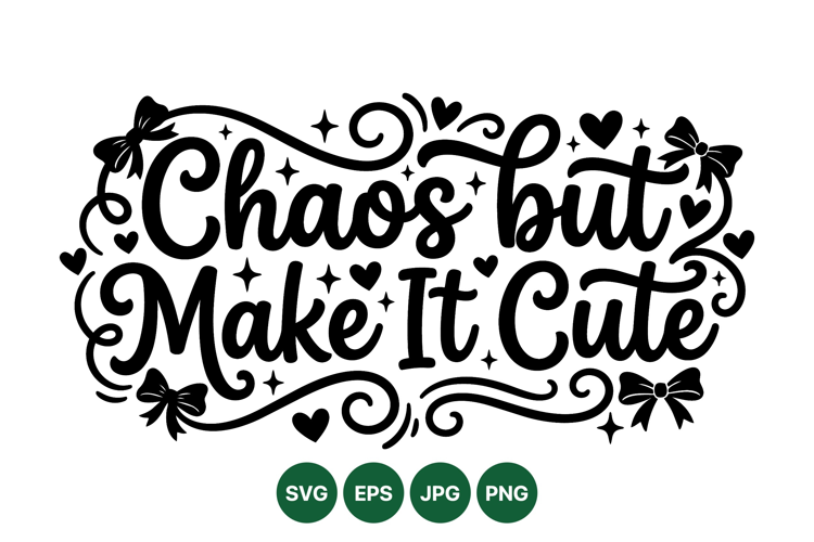 Elegant hand lettered phrase chaos but make it cute decorated with bows hearts and sparkling stars in black vector style for use in posters cards and crafts design