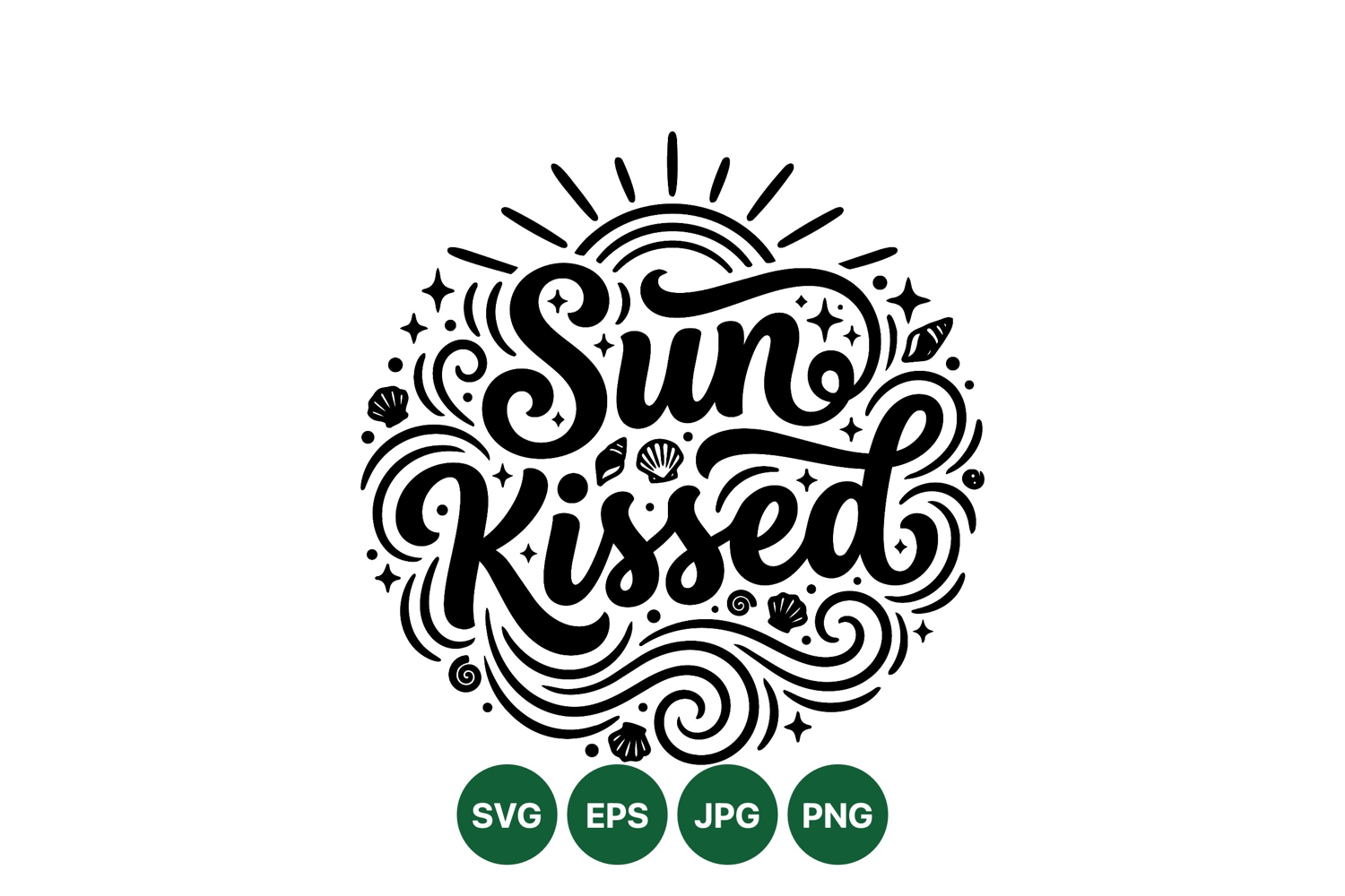 Elegant black and white hand lettering design displays sun kissed phrase surrounded by swirling lines seashells and stars in a circular vector composition stunning for apparel and branding