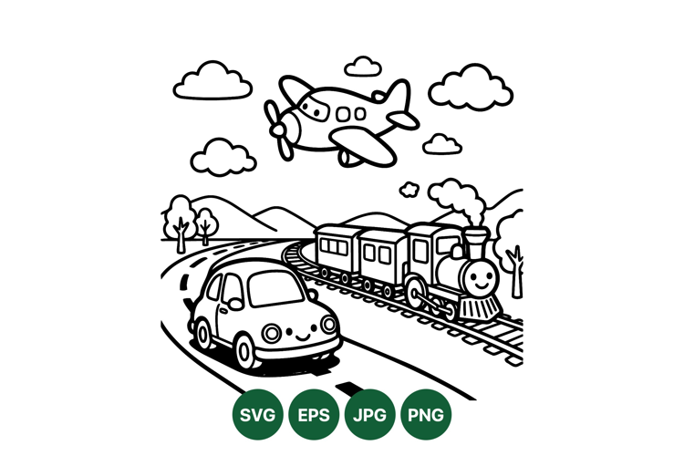 Playful black and white line art features a smiling cartoon train on railroad tracks with a cute car on the road and an airplane flying above under fluffy clouds in a friendly outdoor scene.