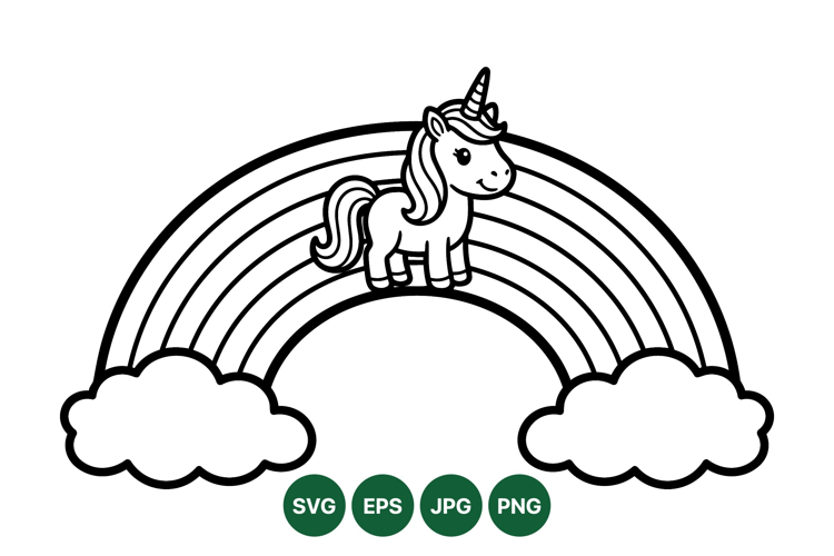 A charming unicorn with a happy expression stands on a curving rainbow with fluffy clouds at each side in a clean black line art style perfect for coloring or children designs playful and whimsical