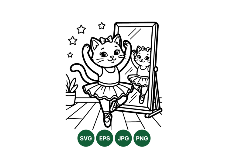 A charming cat character wearing a tutu dress practices ballet dance steps in front of a floor mirror with stars around in a cozy room setting in black and white line art style playful mood
